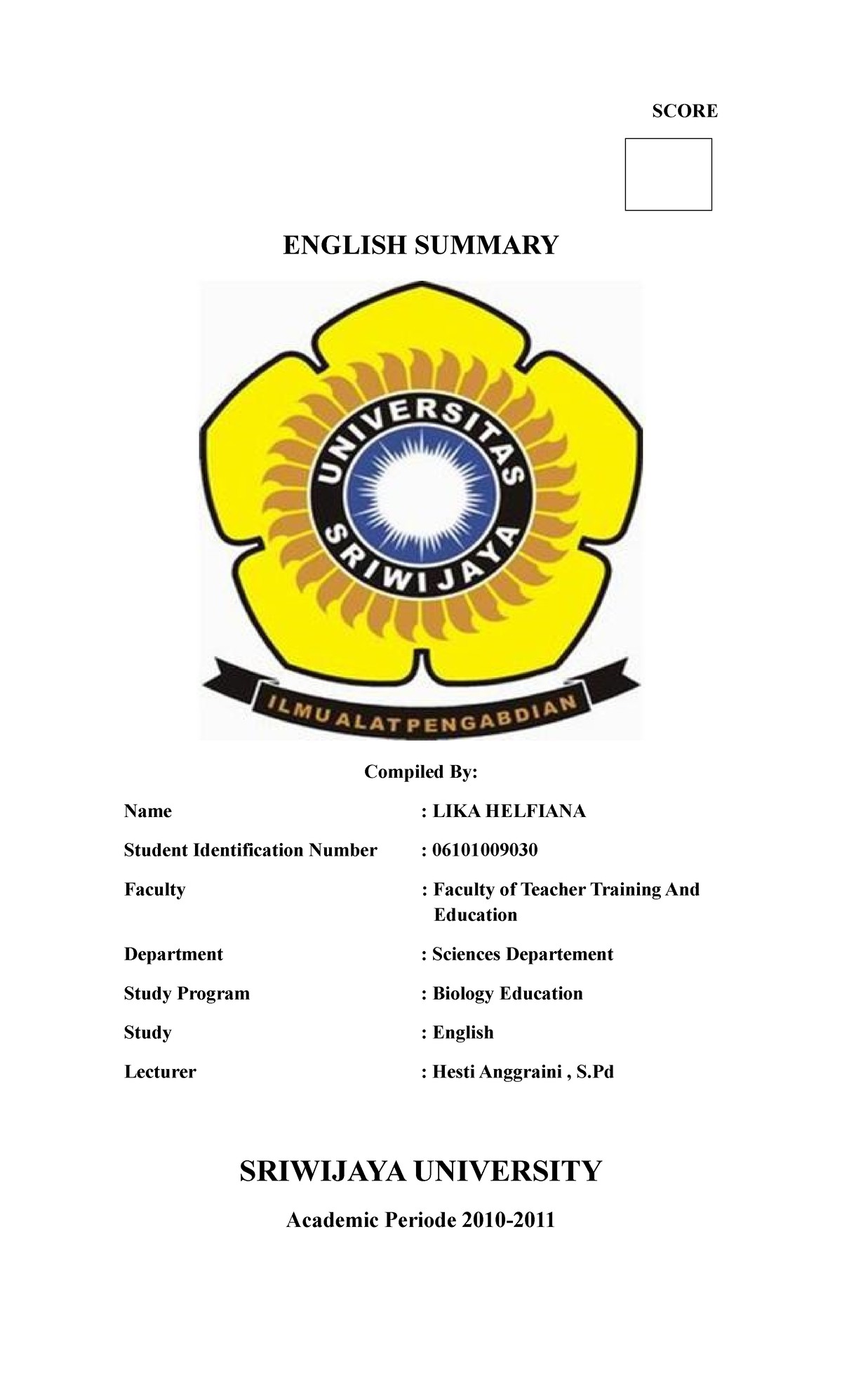 Print Bahasa Inggris Score English Summary Compiled By Name Lika Helfiana Student Studocu